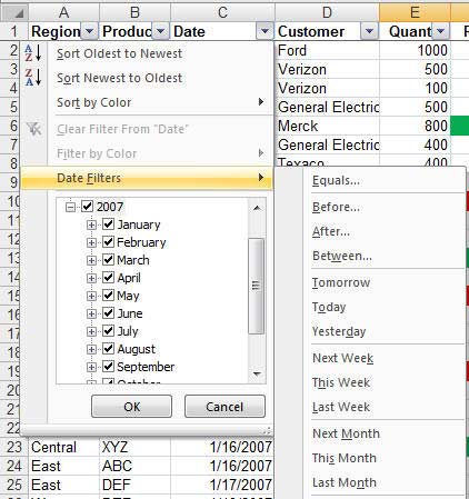 - The dropdown for a date column automatically offers a hierarchical view of the dates. Click the plus sign next to 2007 to see all of the months in 2007. Click the plus sign next to any month to see all of the days in that month. Or, use the new Date Filters to filter to last week, this month, next quarter, and so on.
