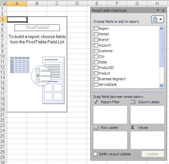 - Assuming Excel selected the correct range for your data, click OK. Excel provides a blank pivot table on a new worksheet. You will notice that the Pivot Table Field List now has a list of fields at the top, and four drop zones at the bottom. Instead of dragging fields to the pivot table, you will drag fields to the drop zones at the bottom of the pivot table field list. The old "Page Fields" area is now called "Report Filter". The old "Data" area is now the " Σ Values" area.