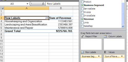 - If you checkmark a text field in the top of the pivot table field list, it will automatically jump to the Row Labels. If you checkmark a numeric field, it will automatically jump to the Σ Values section. Here is a pivot table after checking Business Segment and Revenue.