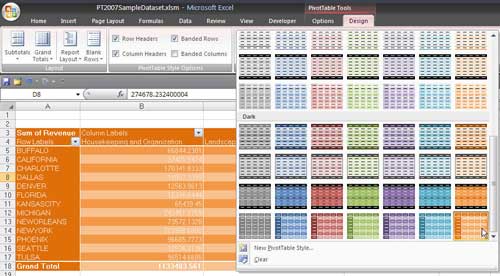 By using combinations of the 4 checkboxes, you can easily access (2 X 2 X 2 X 2 X 85) 1,360 different styles for your pivot table. Don't forget that the 85 styles change if you choose any of the 20 themes on the Page Layout ribbon, so you have 27,200 different layouts available. If none of those work, you can access the New PivotTable Style… command at the bottom of the Pivot Table Styles gallery. (Creating a new style is a topic for another show - we only have 6 minutes!).In this image, I've turned on Row Headers, Column Headers, and Banded Rows and selected a dark orange layout. Note that Live Preview works in the gallery, You can hover over an item to see how it changes.