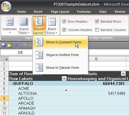 In the next image, a pivot table has two fields in the Row section. Excel 2007 adopts a new layout called "Compact Form" as the default layout. Note that this layout jams both row fields into column A. You might like this layout, but I frequently visit the Report Layout dropdown on the Design ribbon to change back to the Outline Form.