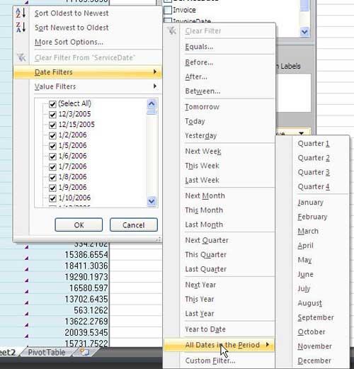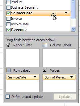 You have always been able to filter fields that were in the Page Area (uhhh, I mean Report Filter area). New in Excel 2007, you can apply filters to fields in the Row area. This is a pretty cool feature. In the next image, ServiceDate is in the row area. Hover over the words ServiceDate in the top of the PivotTable Field List and you will see a dropdown appear.
