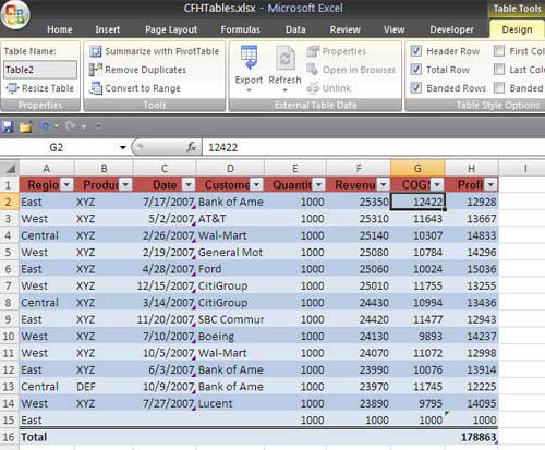 In Excel 2003, Microsoft introduced List functionality (Ctrl+L). They've improved and replaced this in Excel 2007 with table functionality. Most spreadsheets contain data in a tabular format - headings across the top and each row containing a new record. If you have data in a tabular format, select a cell and press Ctrl+T to convert the range to a table.