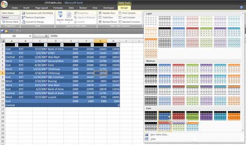 Format with one of 60 different color schemes in the Table Styles gallery. Note that the 6 checkboxes in the Table Style Options group will modify look of each style. (This gallery supports Live Preview - just hover over a style to preview it in the worksheet.