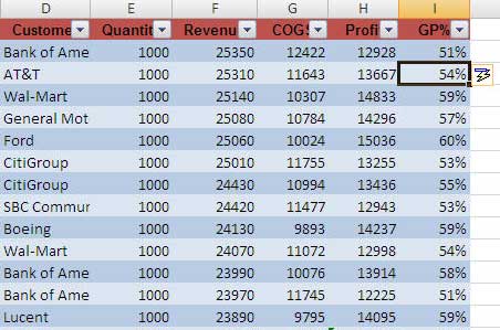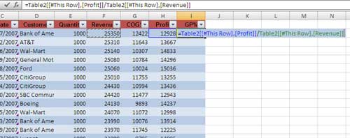 Enter a formula in the first row of a table and have the formula automatically copy to every row. Tip: format cell I2 as a percentage before you enter the formula in I2. Here is the spreadsheet just before I press Enter: