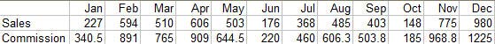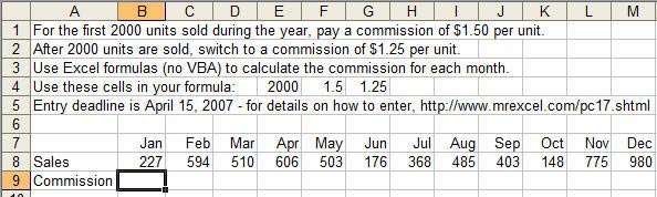 Here is a challenge that many people reading this page can solve. In the figure below, row 8 contains monthly sales figures for a widget. The commission plan for this year is to pay $1.50 per unit for the first 2000 units sold this year. After 2000 units, the commission drops to $1.25. Create formulas to calculate the monthly commission in row 9. Feel free to use additional rows for intermediate calculations.