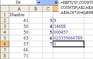 &REPT(“6”,COUNTIF(A$2:A$26,C2*10+6))&REPT(“7”,COUNTIF(A$2:A$26,C2*10+7))