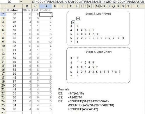 Pivot tables were suggested by Bman-Belgium, and fractaloon. Fractaloon’s pivot chart looks cool and gets points for using Excel’s most powerful feature. However, my son’s middle school math teacher would say that this is not a stem and leaf plot.