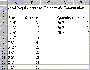 March 1999 Challenge: You are a buyer of steel for a construction company. From the various project plans, you compile the number and sizes of steel needed for tomorrow’s projects. Your suppliers only sell steel in 20, 30, and 40 foot pieces. How can you find an optimal number of bars to order in order to minimize scrap?