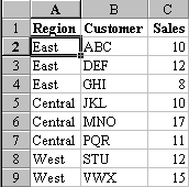 - Sort the range by ascending region and descending sales.