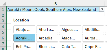 When you open the drop-down in B1 and choose a Location, the Slicer also updates. Any pivot tables connected to the Slicer will update.