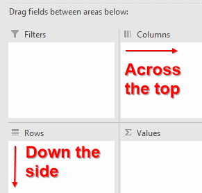 At the bottom are four drop zones with horrible names and confusing icons. Any fields that you drag to the Columns area will appear as headings across the top of your report. Any fields that you drag to the Rows area appear as headings along the left side of your report. Drag numeric fields to the Values area.