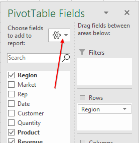You can build some reports without dragging the fields. If you checkmark a text field, it will automatically appear in the Rows area. Checkmark a numeric field and it will appear in the Values area. By choosing Region and Revenue, you will create this pivot table: