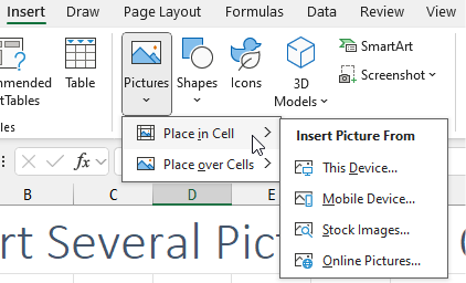 Here is a great use for Place In Cell. Arrange several photos in a folder on your computer. Insert a new picture worksheet in your computer. From a blank cell B4, use Insert, Picture, Place In Cell, This Device. If you specify several images, they will be arranged in a column.