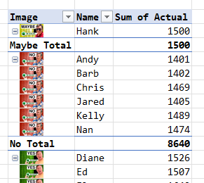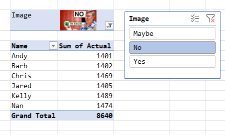 Here is the column of images being used in the Filter drop-down of a pivot table. Note that the image appears in the Filter area, but not in the Slicer.