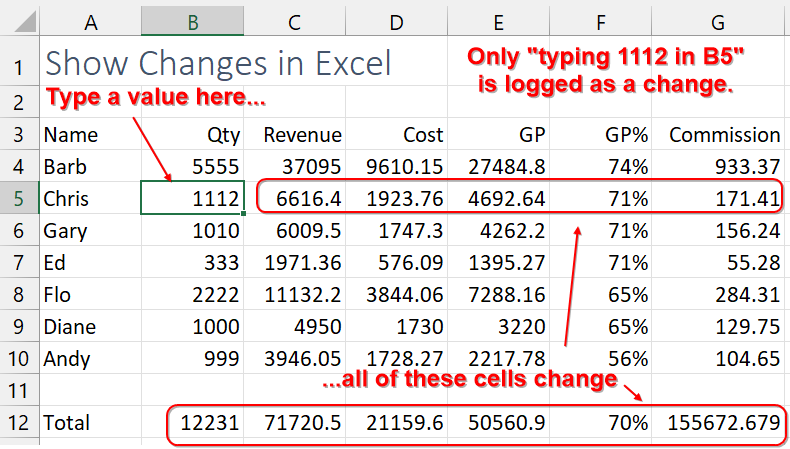Let's say that you have a workbook which had been stored on your local hard drive. Do a File, Save As and save it in OneDrive and then continue editing in Windows. At that point, every change made to a worksheet will be logged. In the figure below, you type a new value in B5. The formulas in many other cells recalculate. But this is simply logged as a change to B5.