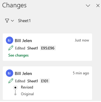 1. On the Review tab in Excel, choose Show Changes. A Changes panel appears on the right side with all changes made to the workbook. 2. A quick way to filter to only the changes for a cell or range is to select the cell, right-click, and choose Show Changes. If you need to clear the Changes pane, use File, Info, Reset Changes Pane. |