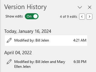 The Show Changes log has dramatically improved the Version History available in Excel. When you go to File, Info, Version History, a panel is displayed with past versions that you can roll back to. Click a version in the Version History panel and you can cycle through each cell that was edited.