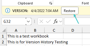 Note that when you are viewing a past version, it is in read-only mode. You can use File, Save As to save the old version with a new name. Or, if you prefer, you can use the Restore button that appears in the Info bar above the Formula Bar. This will replace the current version with the restored version.