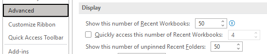 When you choose File, Open, Excel will show you a list of recently opened workbooks. The size of this list is controlled by File, Options, Advanced, Display. The maximum numbers of recent workbooks or folders is 50. If you choose Quickly Access This Number Of Recent Workbooks, then a few workbooks will show in the left pane of the File menu, even in File, Home.