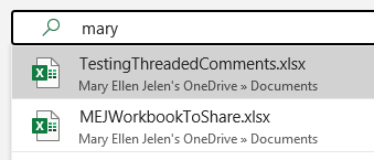 This search box uses a superset of Recommended Files, Most Recently Used and Shared With Me. If you search for "cost accounting", Excel will return files that contain both cost and accounting in any order. |