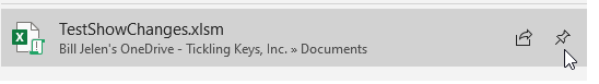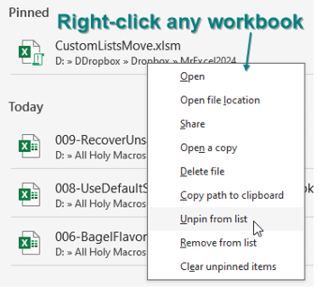 If you hover over any workbook in the File Open screen, a thumbtack appears. Click the icon to pin that item to the top of the recent files list.