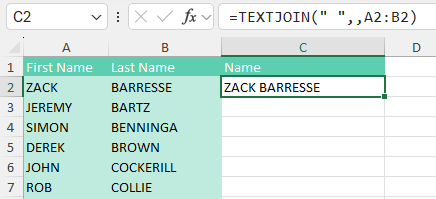 You have thousands of rows of data. You've added a new formula in the top row of your data set, something like =PROPER(A2&" "&B2), or =TEXTJOIN(" ",A2:B2) as shown here. You need to copy the formula down to all of the rows of your data set.