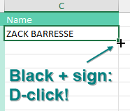 The solution is to double-click the Fill Handle! Go to exactly the same spot where you start to drag the Fill Handle. The mouse pointer changes to a black plus sign. Double-click. Excel looks at the surrounding data, finds the last row with data today, and copies the formula down to the last row of the data set. |