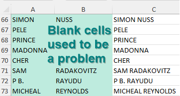 In the past, empty cells in the column to the left would cause the 'double-click the Fill Handle' trick to stop working just before the empty cell. But as you can see below, names like Madonna, Cher, or Pele will not cause problems. Provided that there is at least a diagonal path (for example, via B76-A77-B78), Excel will find the true bottom of the data set. |