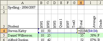 Enter an =SUM function in H4 to total the scores for the first student. Copy this formula down column H for each student and for the points possible line. Excel automatically changes the relative references in the formula to point to the next row, etc.