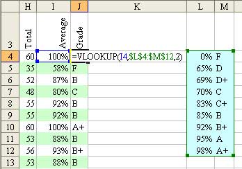 You will use the VLOOKUP function to convert percentages to a letter grade. There are two ways to use the VLOOKUP function, and 90% of the time on this site, I use the version where Excel has to find an exact match in the lookup table. This version, however, uses the version of VLOOKUP where the table contains ranges of data.