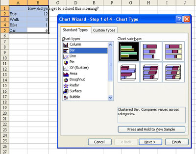 Select the range of data, from the blank cell in A1, through the last cell in column B. From the menu, select Insert - Chart. In the Chart dialog box, choose a Bar Chart on the left side.