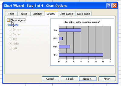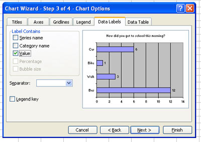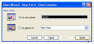 Click Next to go to the 4th step of the wizard. You can either choose to have the chart on a new sheet or embedded on a worksheet. If you want to print a full-page size version of the chart, use New Sheet.
