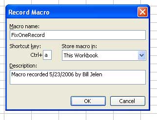 Give the macro a name (no spaces allowed). Choose a shortcut key. Since you will only be using the macro for this task, something like Ctrl + a is easy to remember.