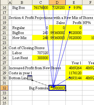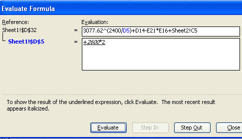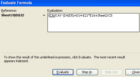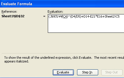 This trick is new in Excel 2003. Select a formula and choose Tools - Formula Auditing - Evaluate Formula. This will open a dialog where you can watch the formula be calculated in slow motion. Here, the underline says that E30 is about to be evaluated.