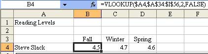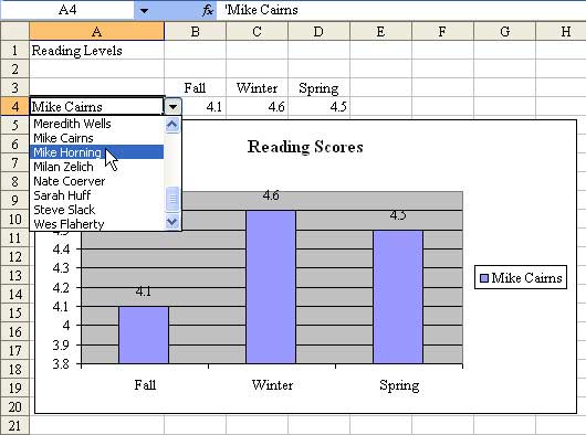 This is a cool chart to share with parents during parent-teacher conferences. All of the reading scores are stored out of sight in rows 34 & below. In the top of the worksheet, you will select a single student from the dropdown in A4. The chart will update to show that student.
