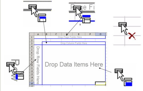 You have to watch the cursor and also the grey squiggly line. For example, if you drop on the left side of column A, the field will be added to the row area, but will be the outermost field. If you drop on the right side of column A, the field will be the inner field in the row area.