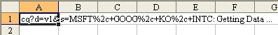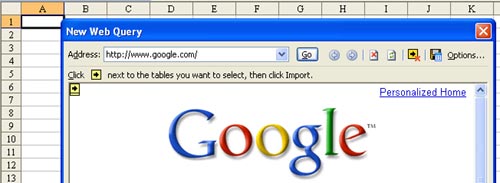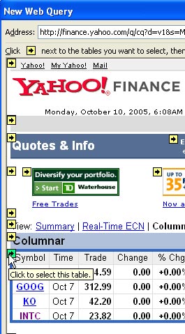 Use the mini-browser to navigate to the web page containing data that you would like to download. In my case, I still had Internet Explorer open, so I simply copied the URL from the address bar in I.E. and pasted into the address bar in the Excel browser. Click Go, the page loads. You will notice that there are many yellow arrows on the page. These arrows point to each table on the page. The Yahoo page has a lot of tables. Some web pages might just have one arrow, to grab the whole page. Click on a yellow arrow to select that table. Once you select the table(s), the yellow arrow(s) turn to green checkmarks.