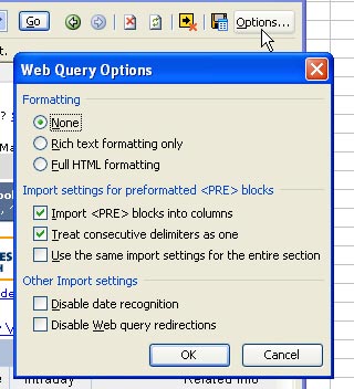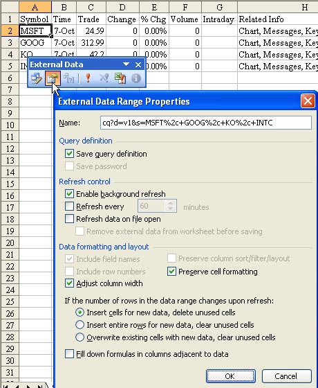 Move the cell pointer so that it is selecting one of the cells inside the imported data range. This will cause all of the buttons on the External Data toolbar to become enabled. The second button is the Data Range Properties button. When you choose this button, you will see the default settings for the web query.