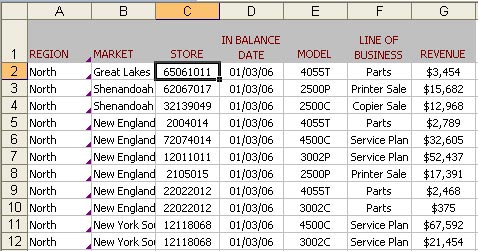 Your data set has columns for revenue, region, market, date, etc. Select one cell within the data.