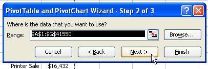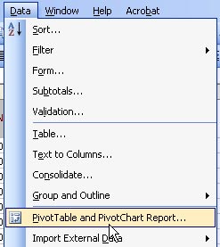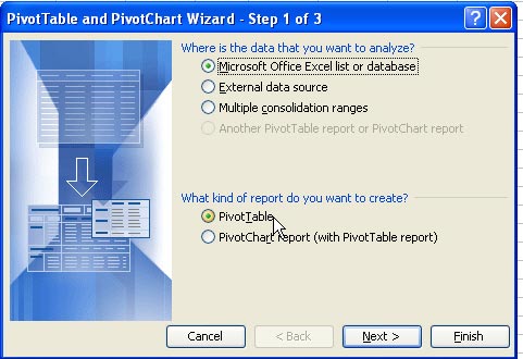 Select one cell in the original dataset. From the menu, select Data - PivotTable. In the first step of the wizard, choose PivotTable.