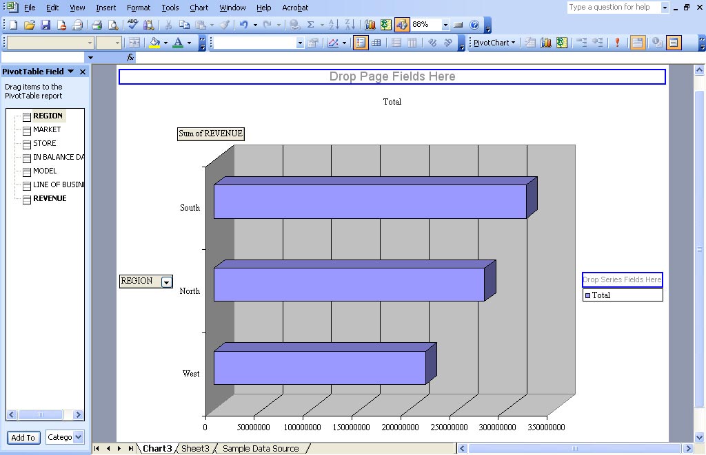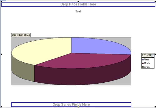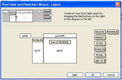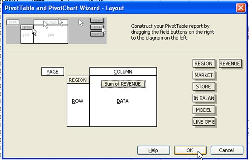 In the Layout dialog, drag Region to the Row area and Revenue to the Data Area. Choose OK to return to the Wizard.