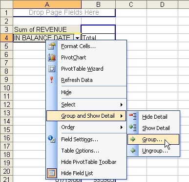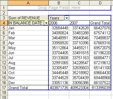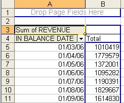 In Step 3 of the wizard, choose the Layout button. In the Layout dialog, drag Revenue to the Data Area and In Balance Date to the Row area.
