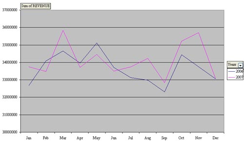 This initial pivot table is a far cry from the year-over-year report. It will be easy to manipulate this as a pivot table, but very hard to do so if it had been a pivot chart.