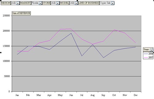 Drag additional fields to the Page Field of your pivot chart. You can then easily query the database. This image shows Copier Sales in California.