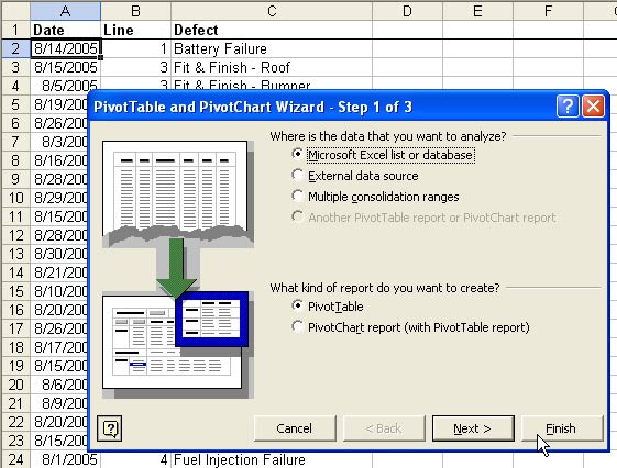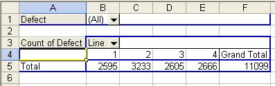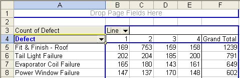 It would be interesting to see if you can learn anything more from this data. For example, is the problem isolated to one assembly line? In the image above, cell B3 is still the spot where you would drop a field to add the field to the Column Area of the pivot table. From the Pivot Table Field List, drag Line and drop it in cell B3. The resulting pivot table is shown below. This data is interesting. While the Tail Light Failure defect happens across all assembly lines, there is something going on with the Roof Fit & Finish. Line 2 has far more problems than the other assembly lines.