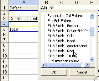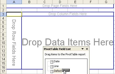 You will be presented with a blank pivot table. You will drag the Defect field from the Pivot Table field list to the "Drop Row Fields Here" area of the pivot table.