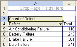 Dropping the Defect field in the Row area will provide a unique list of defects. Next, you want to get a count of how many times each defect occurs. Usually, pivot tables want to sum a field, but you really don't have any fields to sum in this case. If you drag a text field to the data area, Excel will automatically decide to Count the field instead of Sum the field.