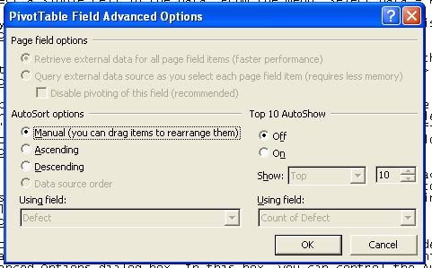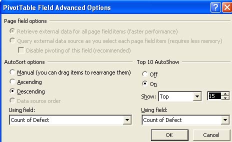 On the left side of the dialog box, choose the Descending button. In the Using Field dropdown, choose Count of Defect. On the right side of the dialog box, Choose to turn on the Top 10 AutoShow feature. Although the feature is called "Top 10", you can use the spin button to change from 10 to 15 or any number. You could also show the bottom 10 or any combination. Once you have all of the settings correct, your dialog box will look like this one.