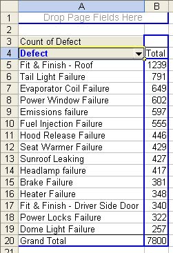 This pivot table shows you the 15 most prevalant problems in the data. This is extremely useful information. The data shows that if you can solve the Fit & Finish problems with the roof, you would solve 1239 defects.